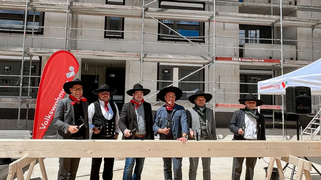 The topping-out ceremony for four apartment buildings on Staudenplatz in Rintheimer Feld in Karlsruhe-Rintheim took place on 11 June. weisenburger bau GmbH celebrated this milestone together with Volkswohnung as the client.