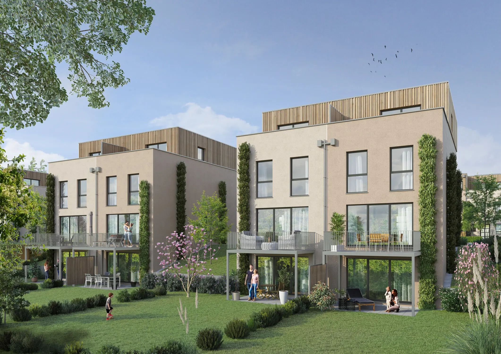 Alle Häuser zeichnen sich durch eine nachhaltige Bauweise aus. Sie werden im Effizienzhaus 40 Standard errichtet, ausgestattet mit Luft-Wasser-Wärmepumpen, Photovoltaikanlagen mit Batteriespeichern und erfüllen damit die höchsten Anforderungen an Energieeffizienz. Darüber hinaus bietet das Quartier ein autoarmes Gebiet, das zu einer umweltfreundlichen und ruhigen Wohnatmosphäre beiträgt. Zudem sind alle Häuser mit dem Qualitätssiegel „Nachhaltiges Gebäude“ (QNG) zertifiziert, wodurch Käufern die Möglichkeit geboten wird, zinsgünstige Förderkredite der KfW-Bank zu nutzen.
