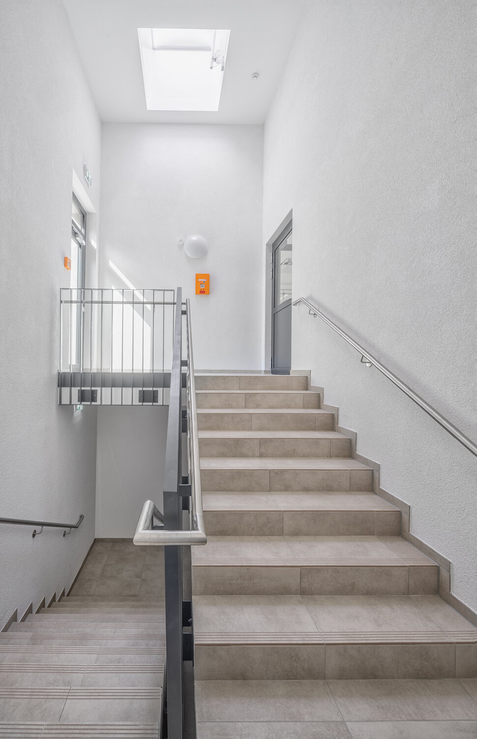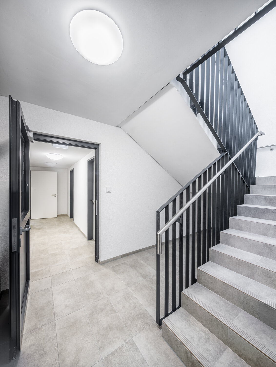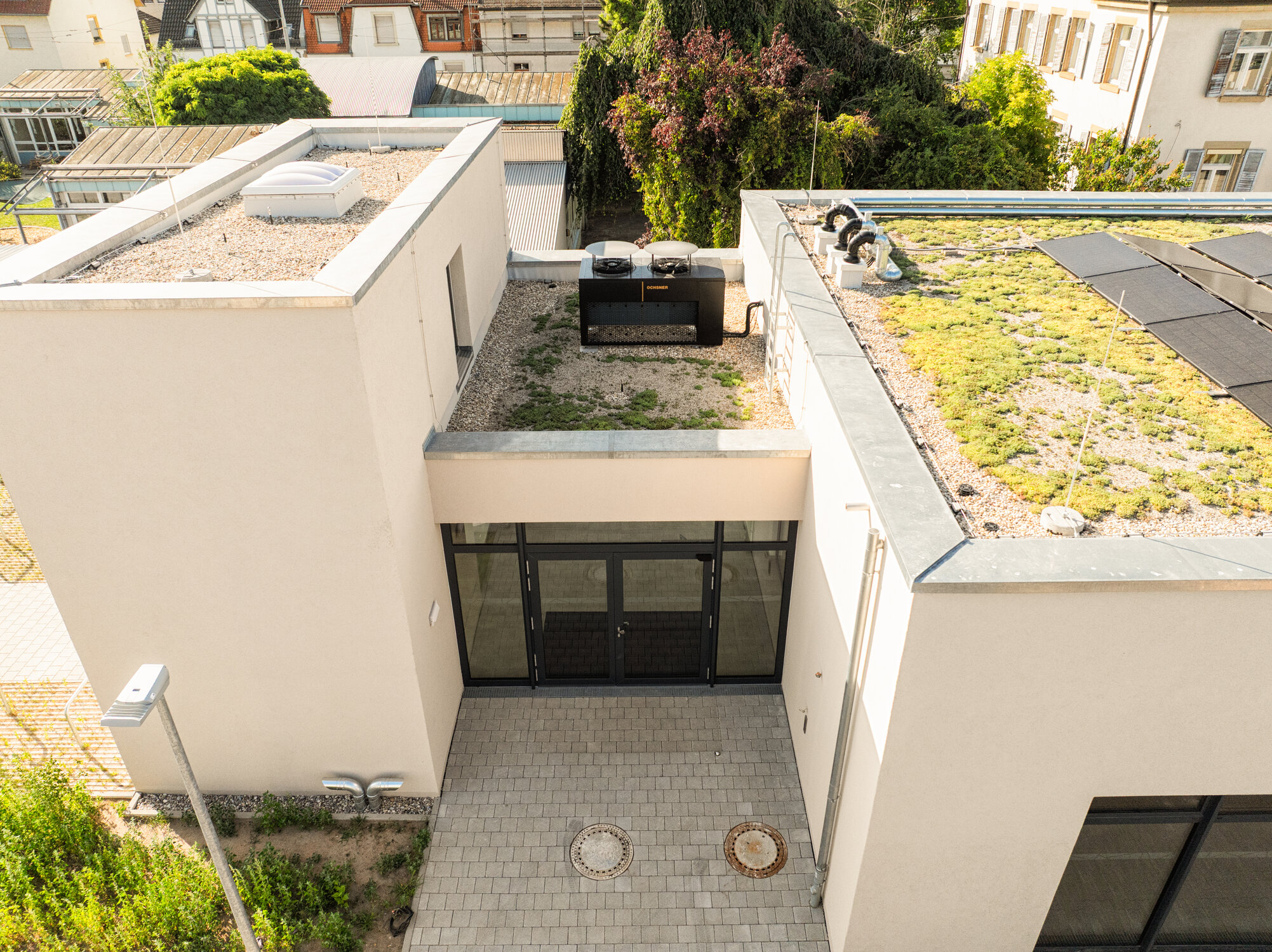 The building was constructed in accordance with the criteria of the 2020 Building Energy Act (GEG) and meets the KfW Bank's requirements for energy-efficient construction as a BEG Efficiency House 55 EE. A central air-to-water heat pump on the roof ensures an environmentally friendly energy supply. The green flat roof supports the microclimate and contributes to the ecological enhancement of the location.