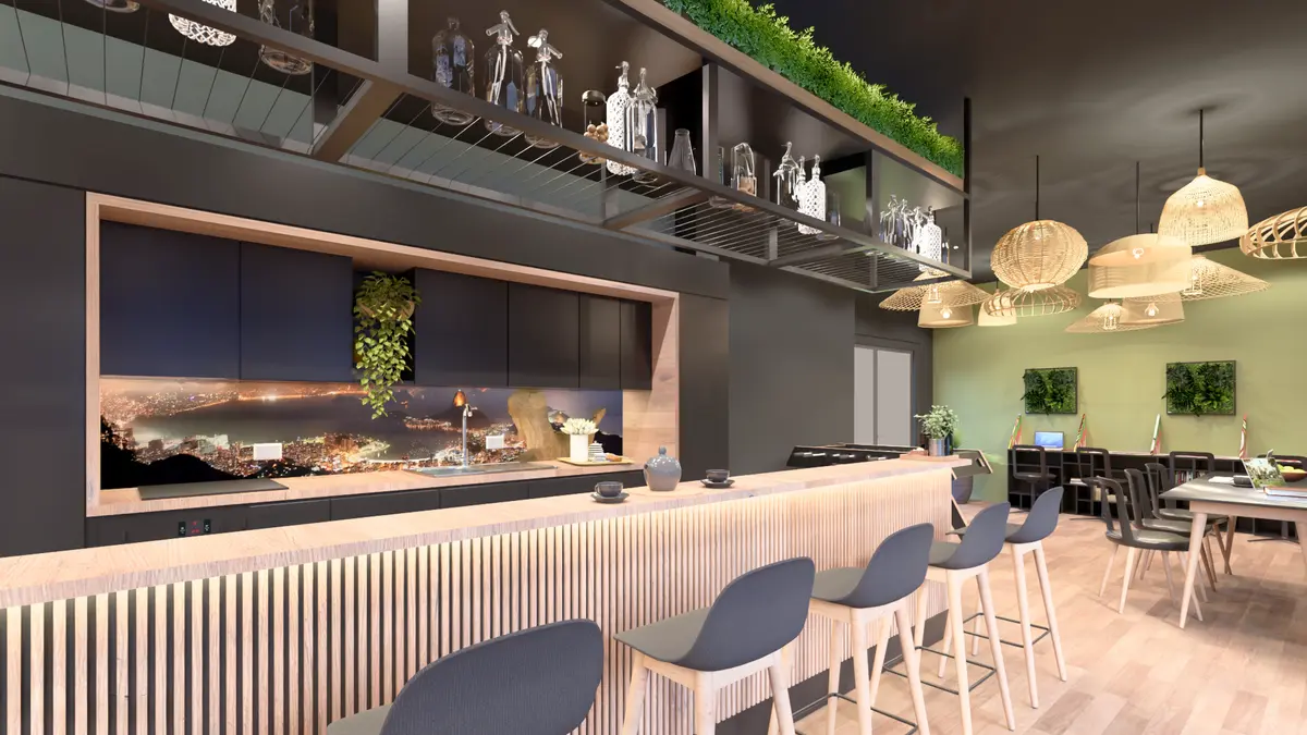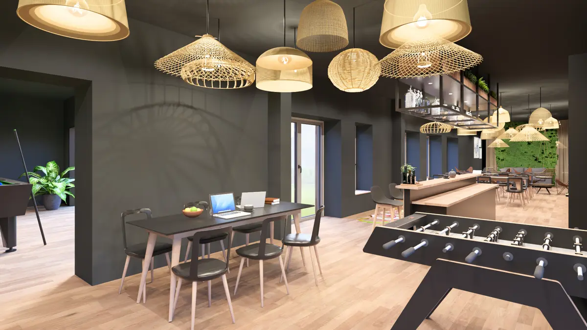 - Community Area mit Außenbereich, Küche, Bar & Tischkicker