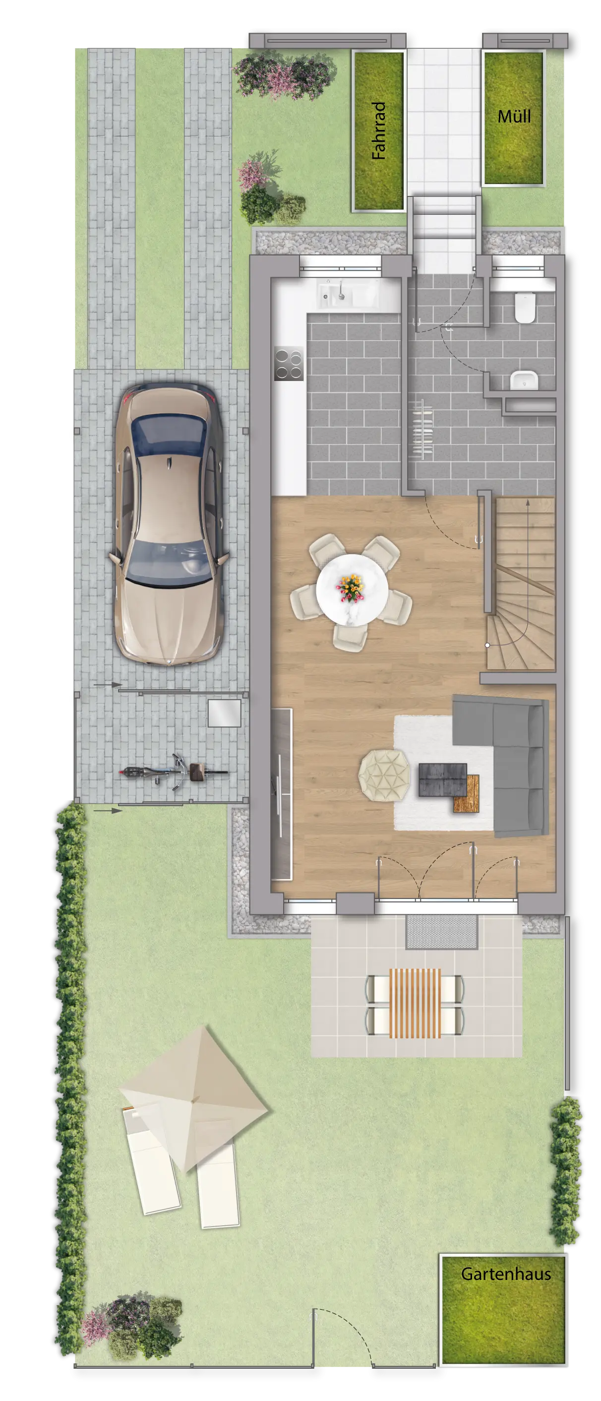 - Carport mit Fahrradabstellplatz und Mülleinhausung