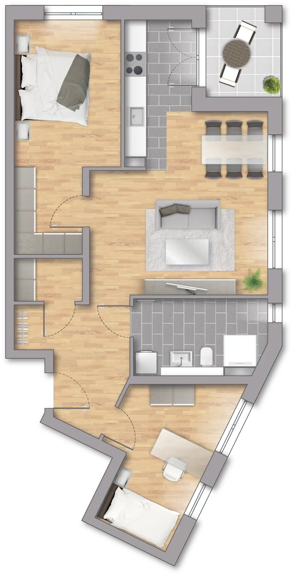 - Massives Eichenparkett in allen Wohn- und Schlafräumen