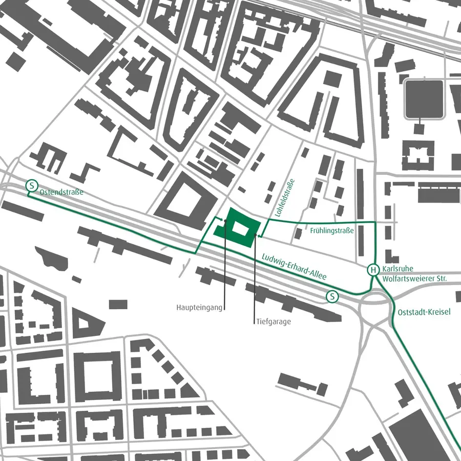 Ausfahrt B10 nehmen, der Straße folgen bis zum Oststadtkreisel. Nehmen Sie die erste Ausfahrt (Wolfartsweierer Str.) und biegen Sie dann gleich wieder links ab (Frühlingsstraße). Danach biegen Sie wieder links in die Lohfeldstraße ein, wo Sie auf der rechten Seite die Einfahrt zur Tiefgarage sehen können.